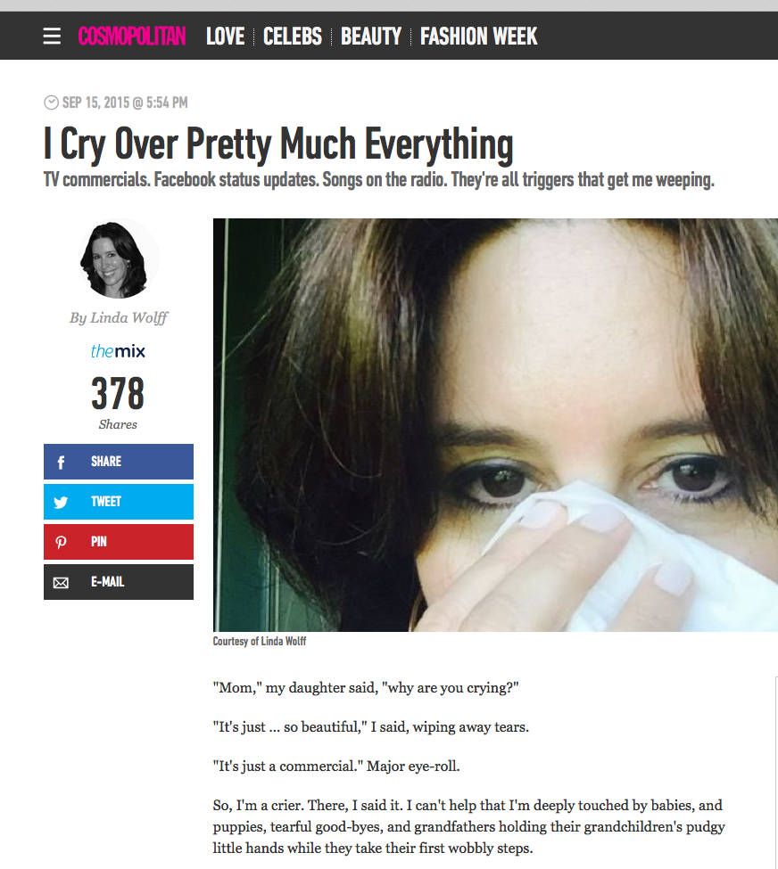 First, CONGRATS on your article in Cosmo!!! Fantastic. Second, I too, am a crier. And I think now, I love that about me. I am easily manipulated into seeing the touching, sentimental part of life and so be it. Thank God for criers….otherwise we’d all be a bunch of insensitive jerks, and there’s certainly enough of them!